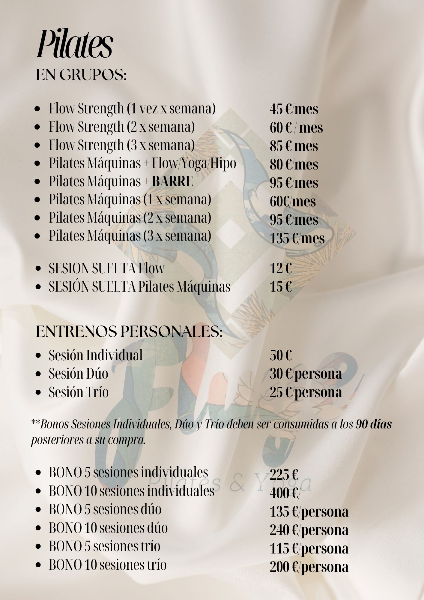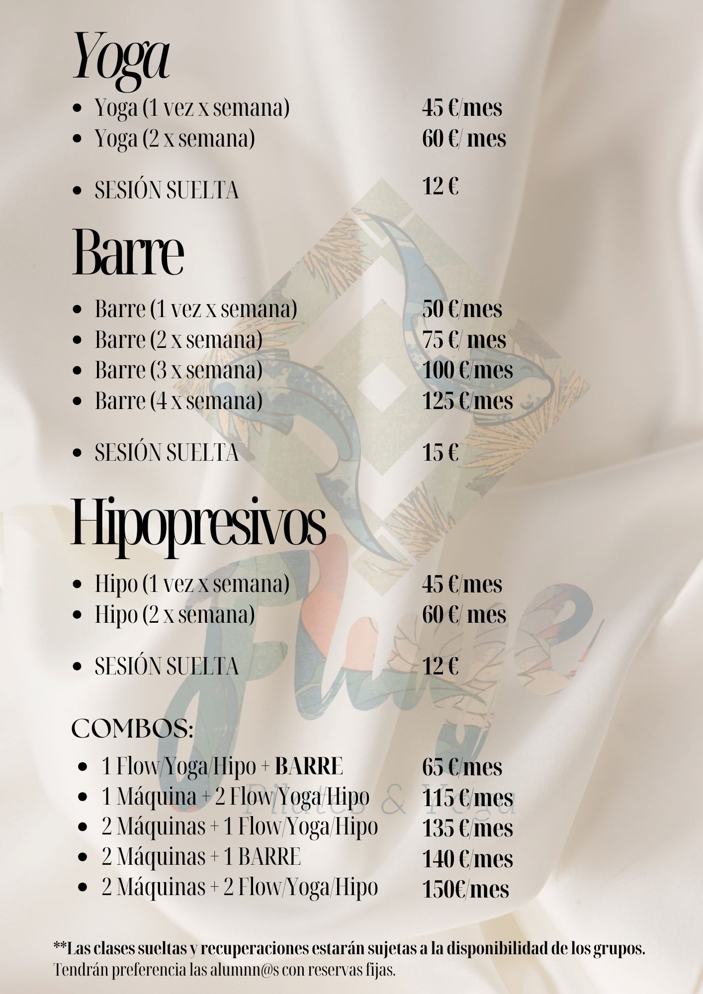 PRECIOS YOGA, BARRE, HIPOPRESIVOS